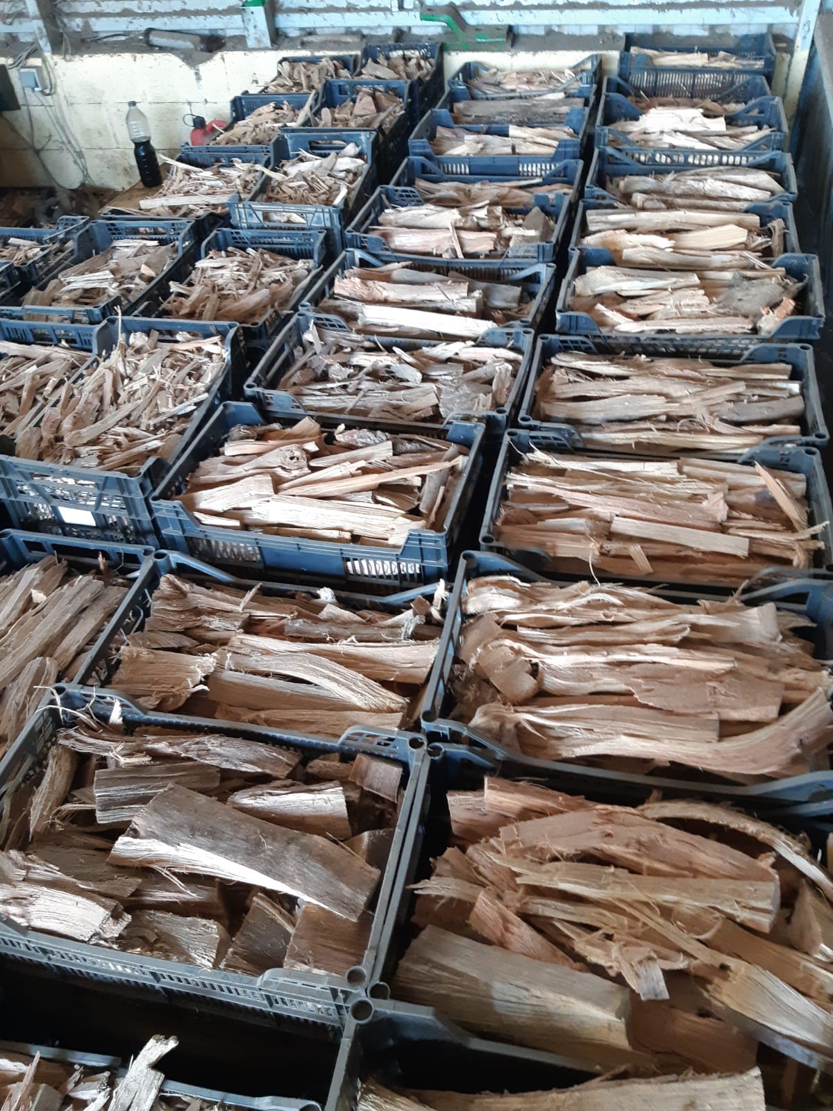 Cajas de astillas, ideales para empezar el fuego y después introducir los troncos para un bonito fuego en el hogar, idóneos para las “calçotadas” y barbacoas por sus rápidas y intensas llamas.